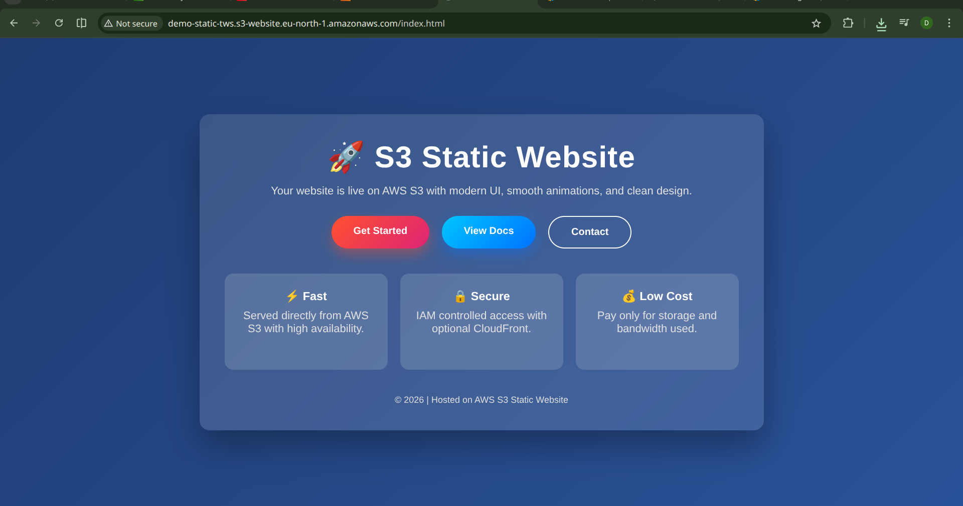 This project demonstrates how to host a static website on Amazon S3 and manage it using AWS CLI. It also covers creating an EC2 instance and IAM user to securely access and control S3 resources.